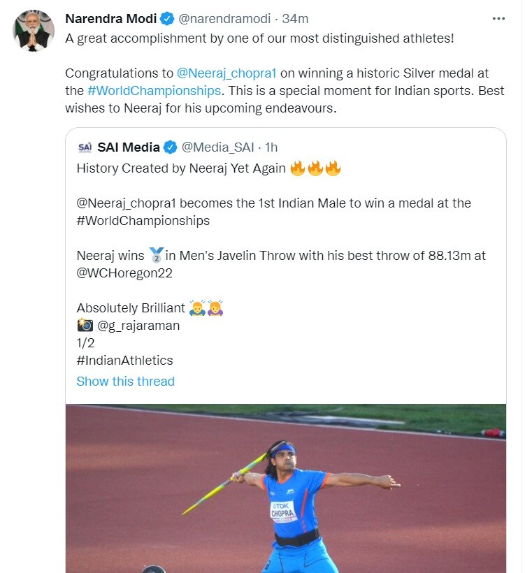 The whole country is happy on this historic success of Neeraj Chopra. Prime Minister Narendra Modi also tweeted and congratulated this athlete who won the gold medal of Tokyo Olympics. He wrote, “Great achievement by one of our most iconic athlete. Neeraj Congratulations to you for winning the historic silver medal in the world championship. This is a skinny moment for Indian sports. Wishing you all the best for future competitions.”